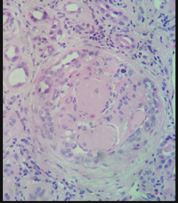 Diabetic nephropathy (DN) is a common complication of both type 1 and type 2 diabetes mellitus. Prolonged hyperglycemia in diabetes results in glycosylation of endothelial proteins, inflammation, and increased production of growth factors, collagen, and fibronectin. Over time, this results in mesangial expansion, glomerular basement membrane thickening, and glomerular sclerosis.