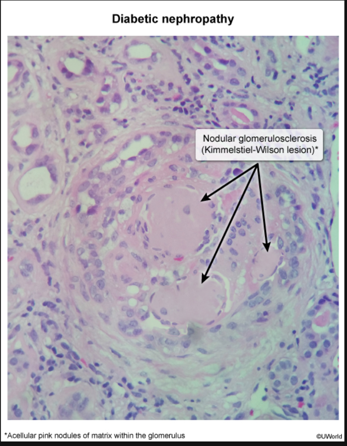 When the glomerular sclerosis is nodular, it is described as a Kimmelstiel-Wilson (KW) lesion and is pathognomonic for DN. KW lesions consist of dense hyaline deposits and commonly arise from the glomerular arterioles. As the disease progresses, increased mesangial matrix proteins can lead to global glomerulosclerosis.