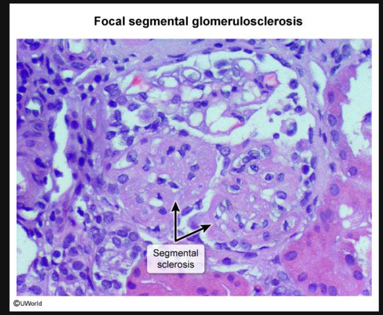 Focal segmental glomerulosclerosis causes nephrotic syndrome and is associated with foci of sclerosis and hyalinosis in some, but not all, glomeruli.