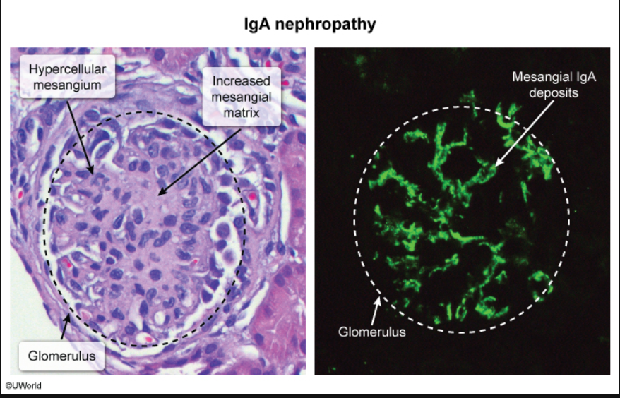 Light microscopy demonstrates mesangial proliferation, and immunofluorescence demonstrates mesangial immune deposits composed of IgA.