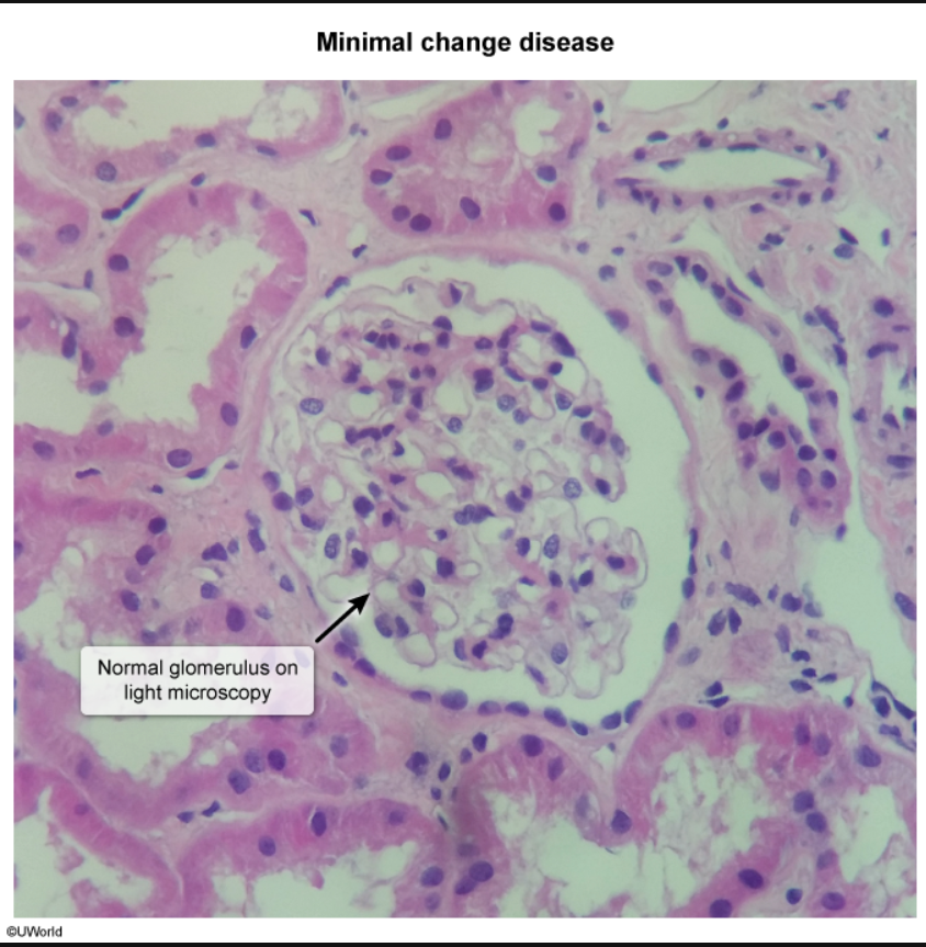 Light microscopy demonstrates normal glomeruli, but electron microscopy demonstrates diffuse effacement of podocytes.