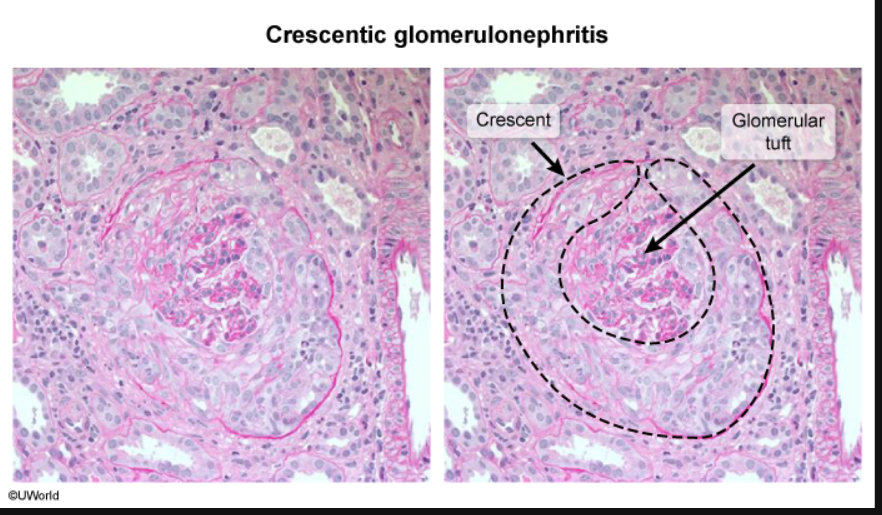light microscopy demonstrates glomerular crescents composed of proliferating parietal and inflammatory cells.