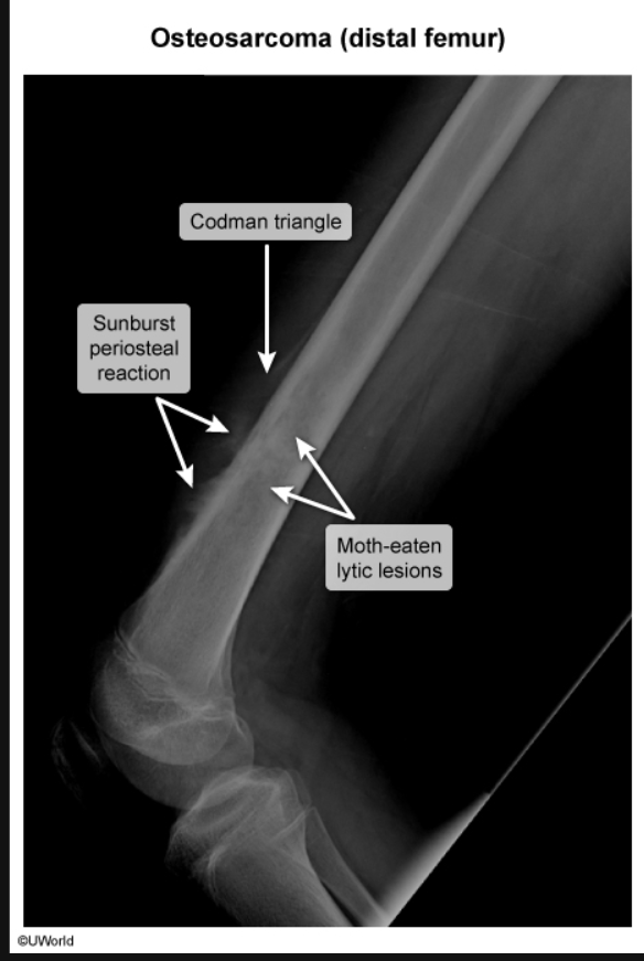 Radiographic findings of osteosarcoma include destruction of the normal trabecular bone pattern, mixed radiodense (sclerotic) and radiolucent (lytic) areas, and periosteal new bone formation with lifting of the periosteum (Codman triangle). Adjacent soft tissue often demonstrates ossification in a “sunburst” pattern.