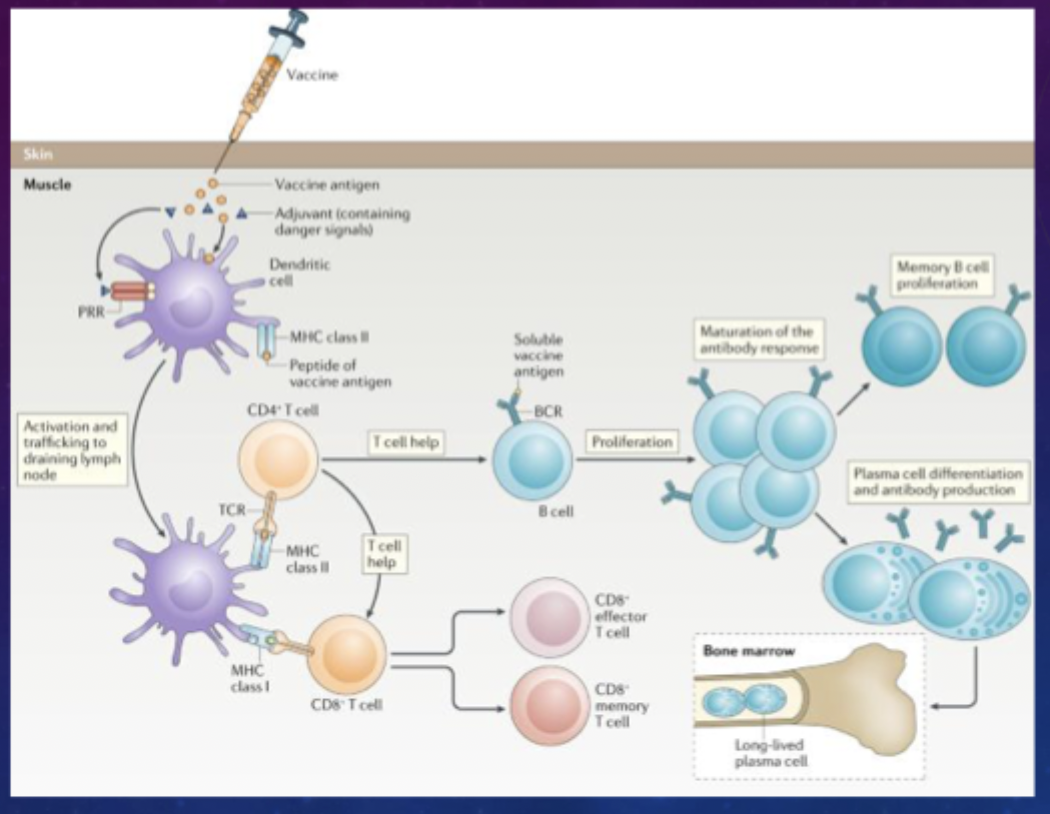 3) They migrate to local lymph nodes where the process and present peptide from the vaccine to T cells (both CD4+, MHC Class II and CD8+ T cells, MHC Class I )