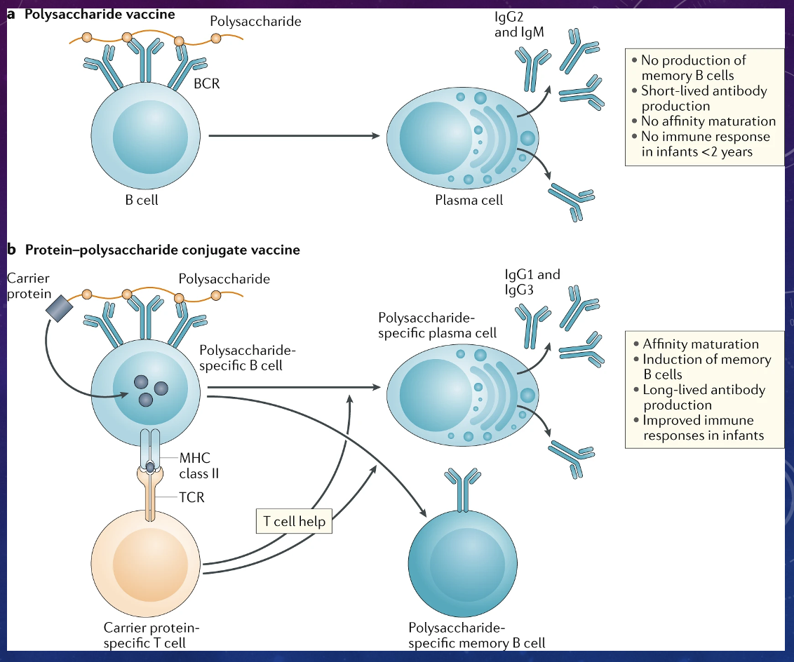 -Polysaccharides attached to a carrier protein which is strongly antigenic; immune system now cares about polysaccharide