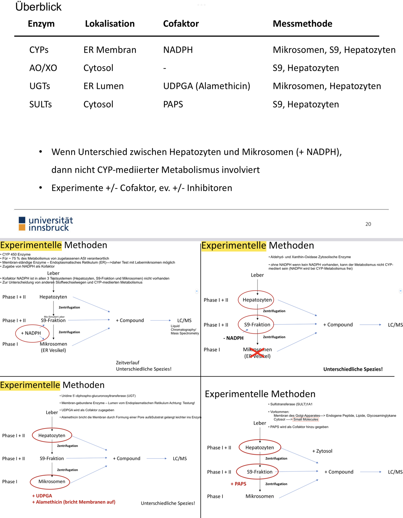 Geben Sie eine Übersicht wo sich die in der Vorlesung behandelten metabolischen Enzyme in der Zelle befinden, wie Sie den durch sie verursachten metabolischen Turnover experimentell bestimmen können und welche Co-Faktoren Sie gegebenfalls benötigen. (6P)