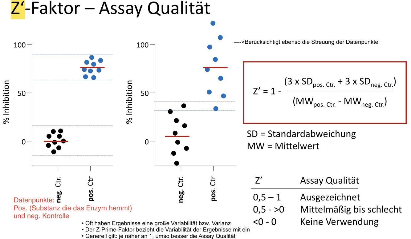 Beim High-Throughput Screening (HTS) vergleichen Experimentatoren häufig eine große Anzahl (Hunderttausende bis Zehnmillionen) Einzelmessungen unbekannter Proben mit positiven und negativen Kontrollproben. Ein dabei verwendetes statistisches Maß, der Z’-Faktor, bewertet die Qualität und Zuverlässigkeit eines HTS-Assays und zeigt an, wie gut der Assay zwischen positiven und negativen Kontrollen unterscheiden kann.