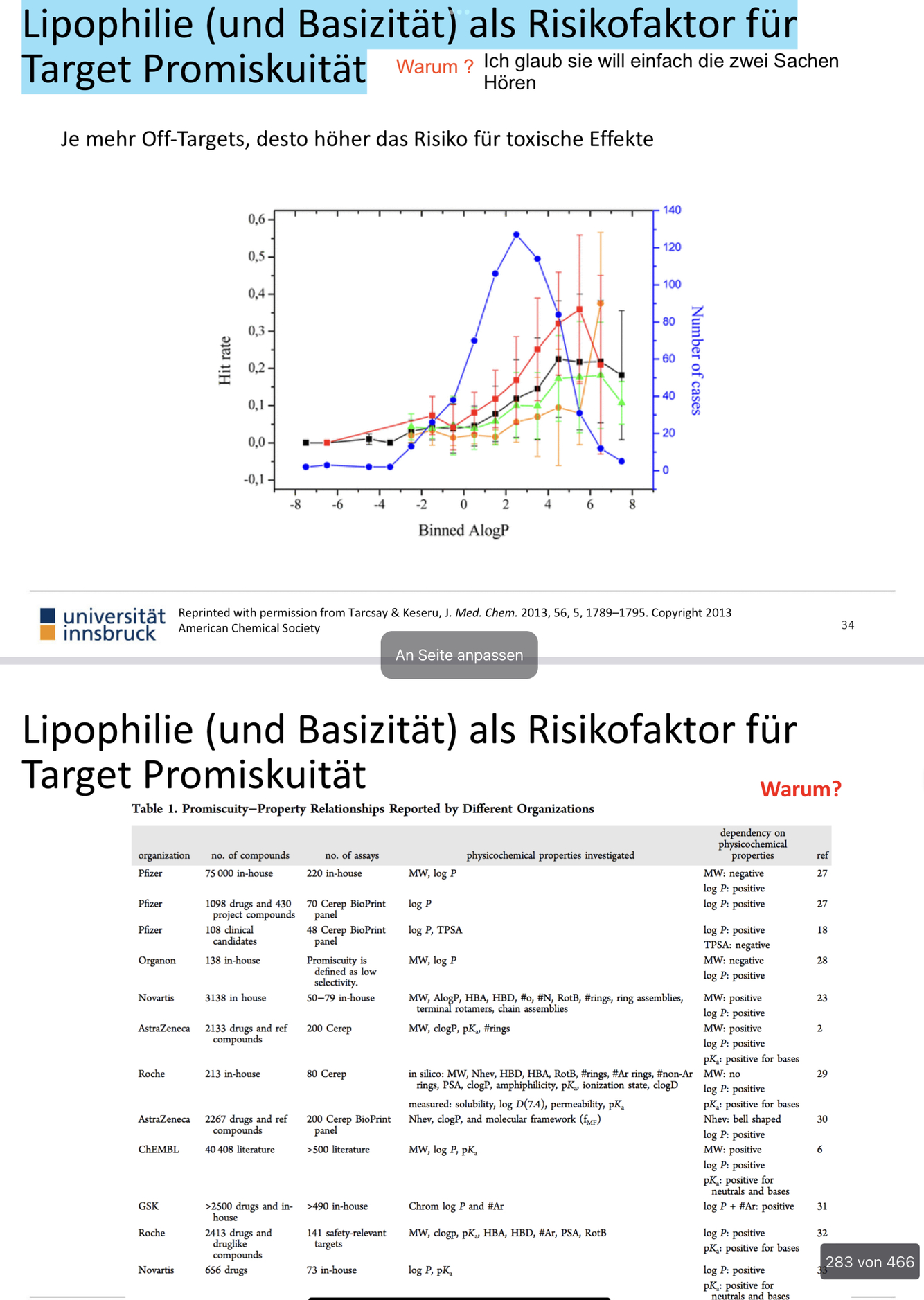 Target Promiskuität, definiert als die Fähigkeit des Liganden, mit mehreren Protein Targets zu interagieren, stellt ein Paradoxon in der Pharmakologie dar (—> “einem Wirkstoff - ein Zielmolekül” zu “einem Wirkstoff - viele Zielmoleküle“). Die Toxizität resultiert oft aus einer unspezifischen Modulation von Off-Targets (Promiskuität).