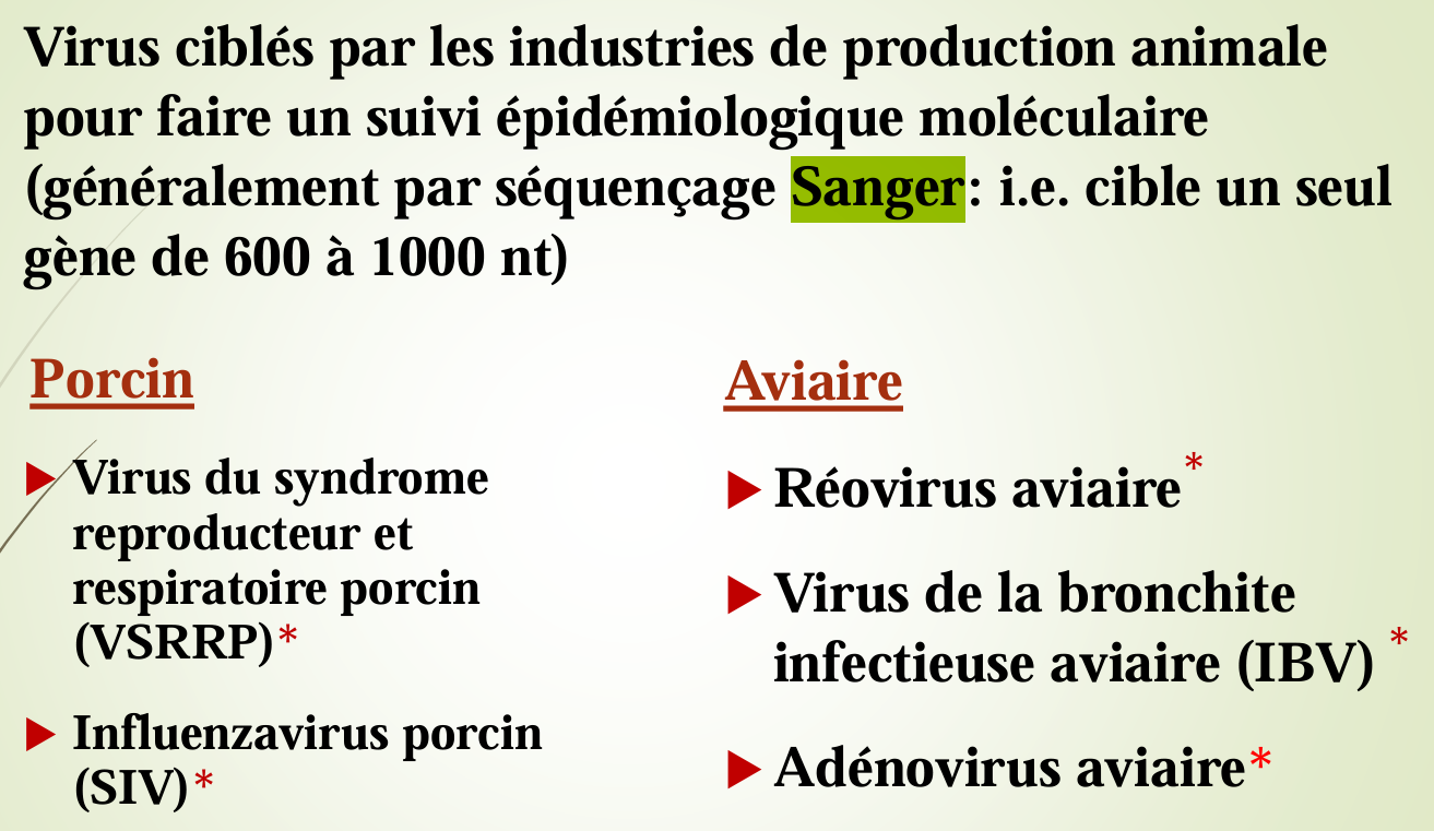 Veuillez identifier les virus qui sont régulièrement ciblés par les industries en production animale du Québec pour faire un suivi épidémiologique moléculaire (par méthode de séquençage Sanger) des souches virales. (correction négative)