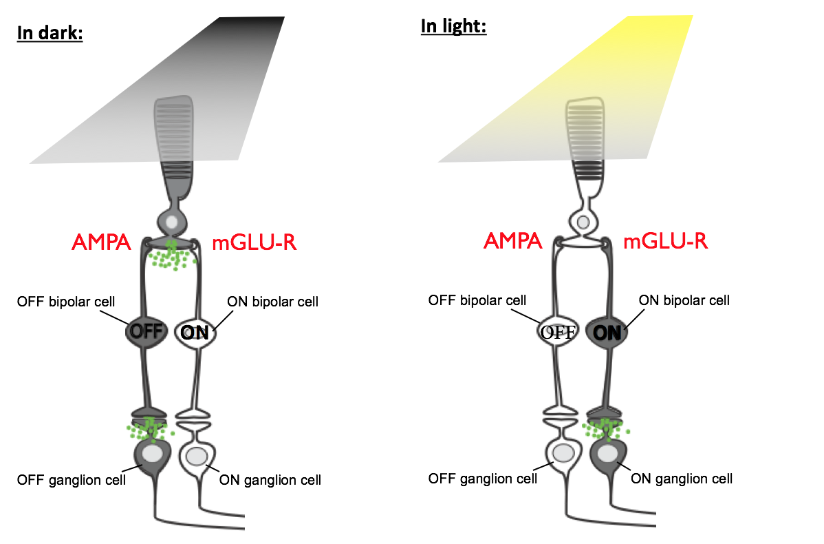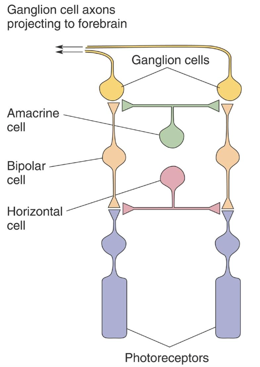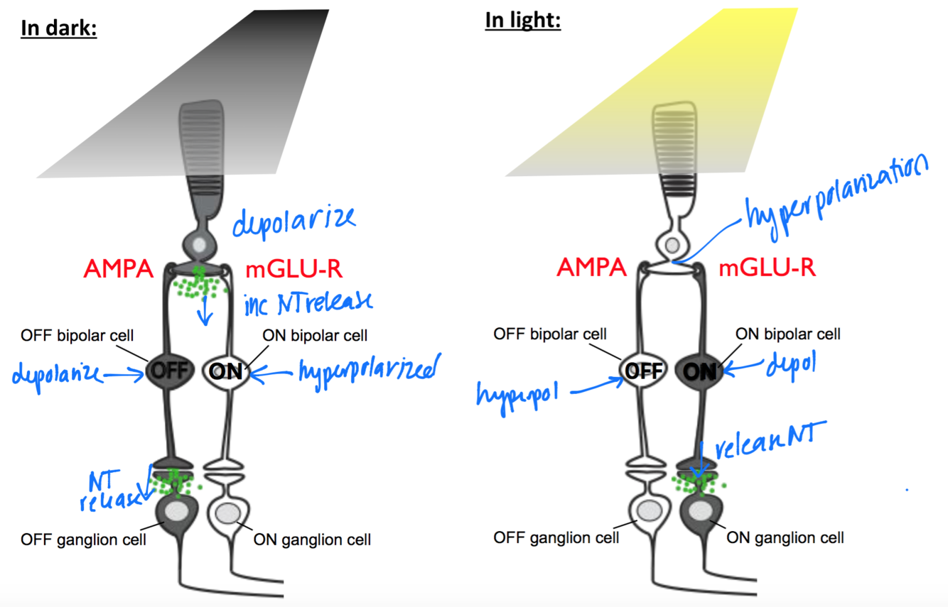do not fire action potentials, two types: OFF- depolarize in response to dark, express AMPA receptors, synapse onto OFF ganglion cells. ON- depolarize in response to light, express metabatropic glutamate receptors (mGluR) that closes a cation channel, synapse onto ON ganglion cells