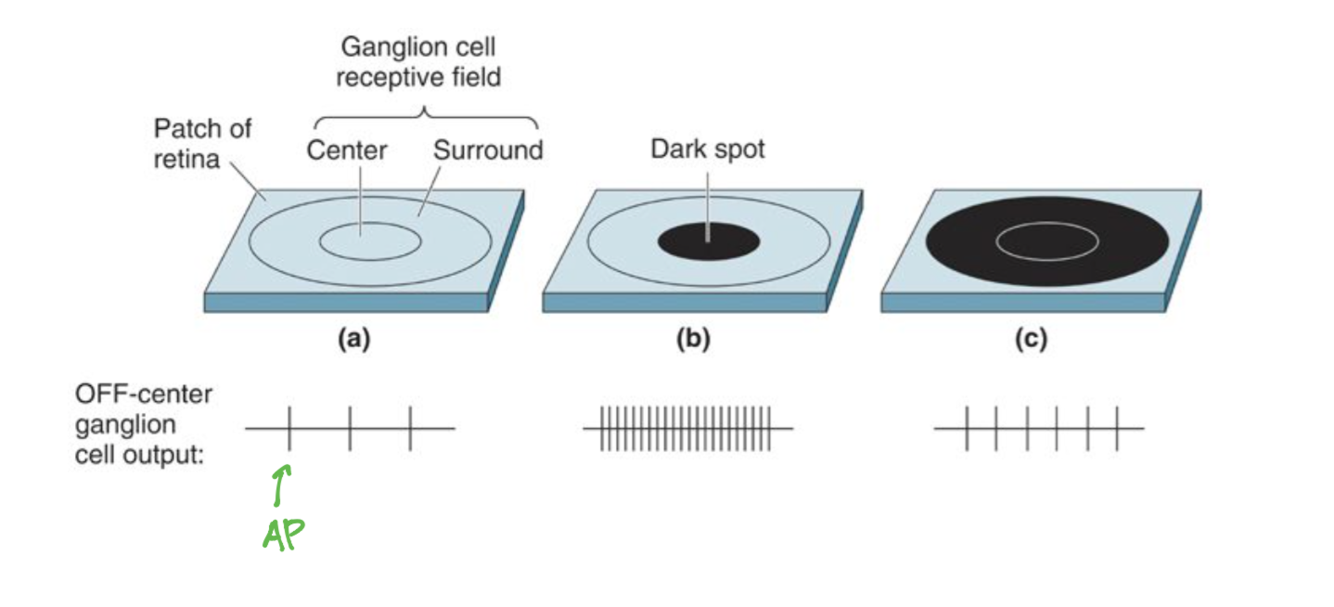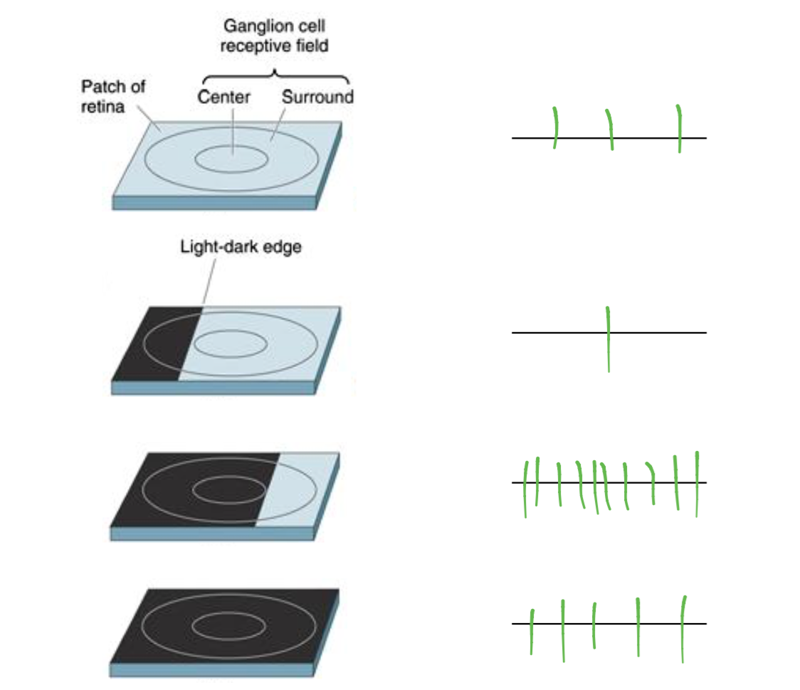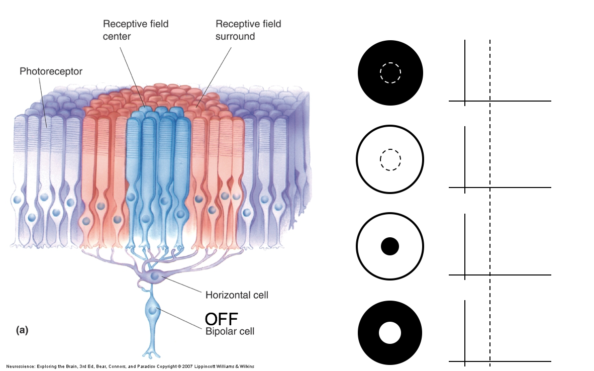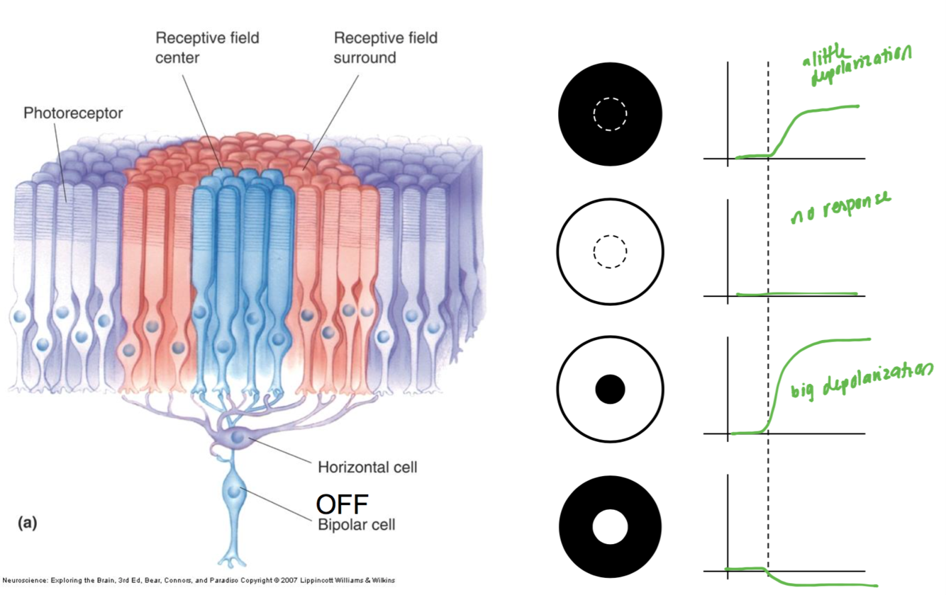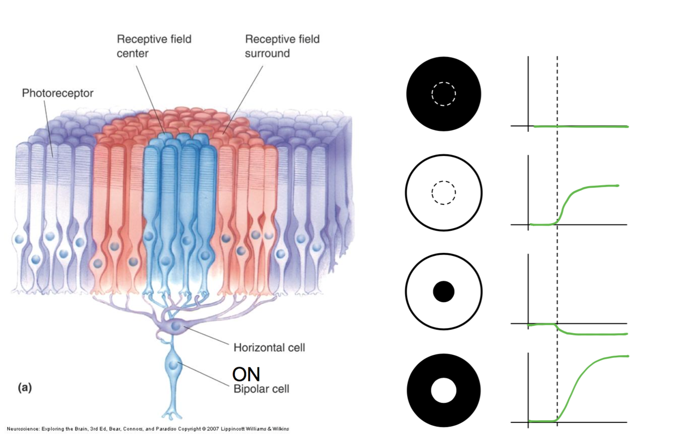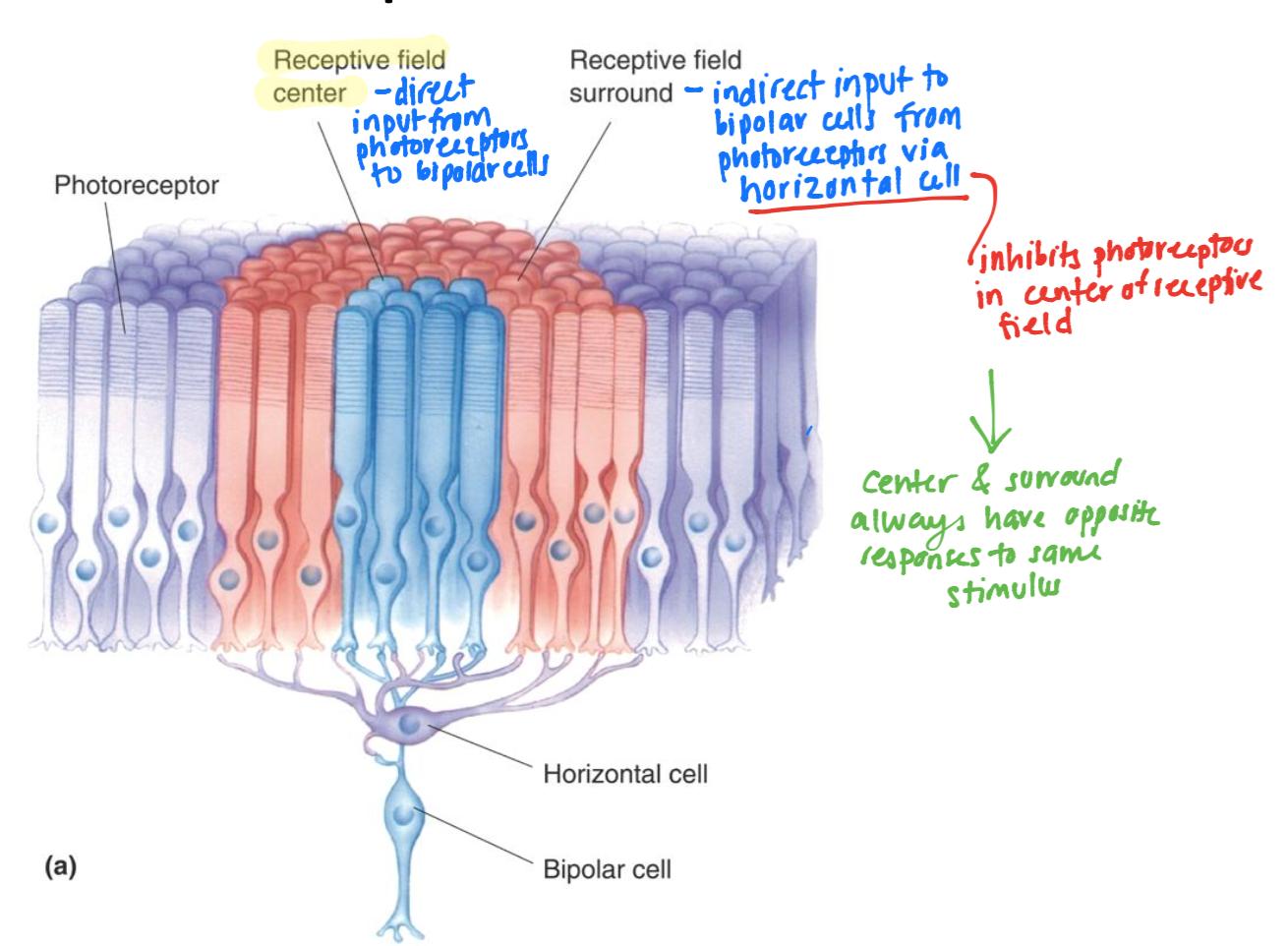 surround: indirect input to biploar cells from photoreceptors via horizontal cell