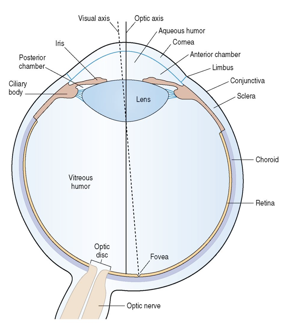 * Information from the nasal half of each retina crosses the midline in the optic chiasm and projects to the contralateral visual cortex.