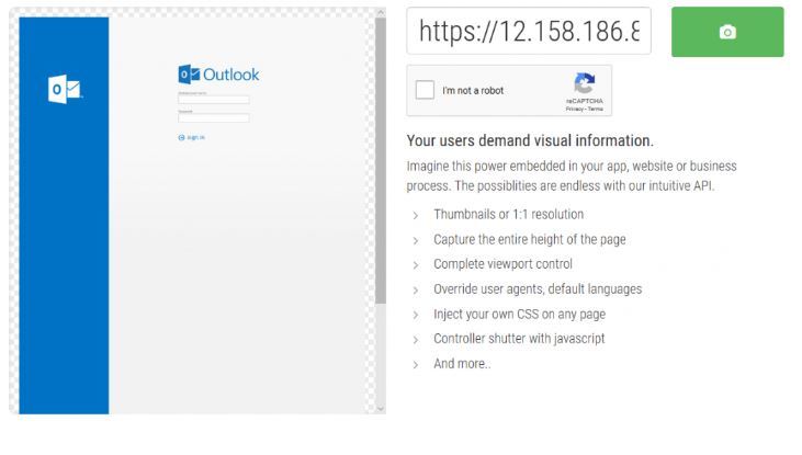 URL2PNG is my go-to tool for visualization. You simply enter in a URL, hit go, and it’ll provide you with a screenshot of what the webpage looks like. Let’s go through a couple of examples. The screenshot below shows me entering a malicious URL for a real-world Outlook Web Access credential harvester into the tool:
