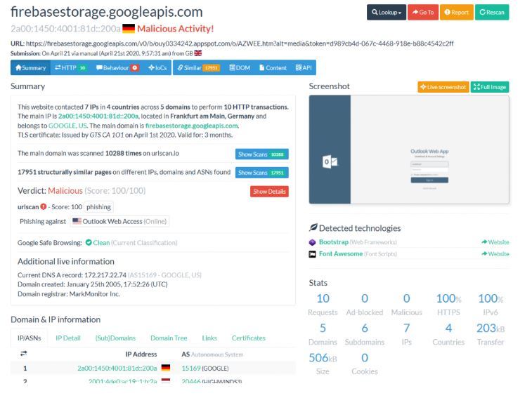 URLScan, amongst other information this tool gathers on a searched URL, has the ability to provide a screenshot. In this example, you can see a screenshot has been taken on the right-hand side, allowing us to see what the destination web page looks like. In this case, it is an Outlook Web App credential harvester.