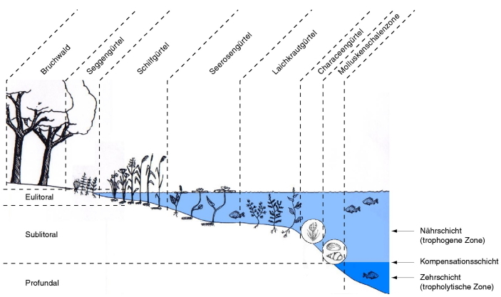 Beschreiben Sie die Zonierung der Makrophytenvegetation eine eutrophen Sees.