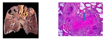 Gross specimen = cavitations in R upper lobe (most common area for TB infection)