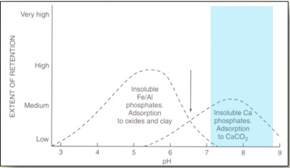 Above pH 6, P is generally made unavailable by forming insoluble calcium phosphates and being adsorbed to calcium carbonate.