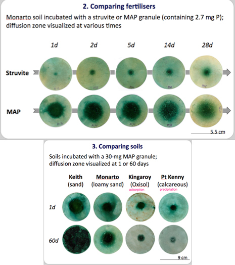 The amount that P fertilisers diffuse through the soil (and the time they do it in) varies between fertilisers and locations