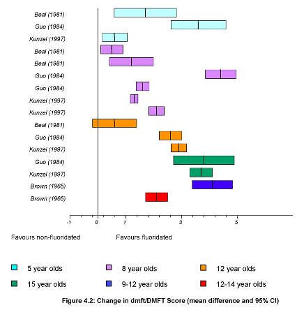 Vertical line is no difference and we can see they all favour fluoridation.