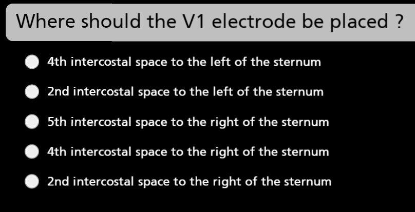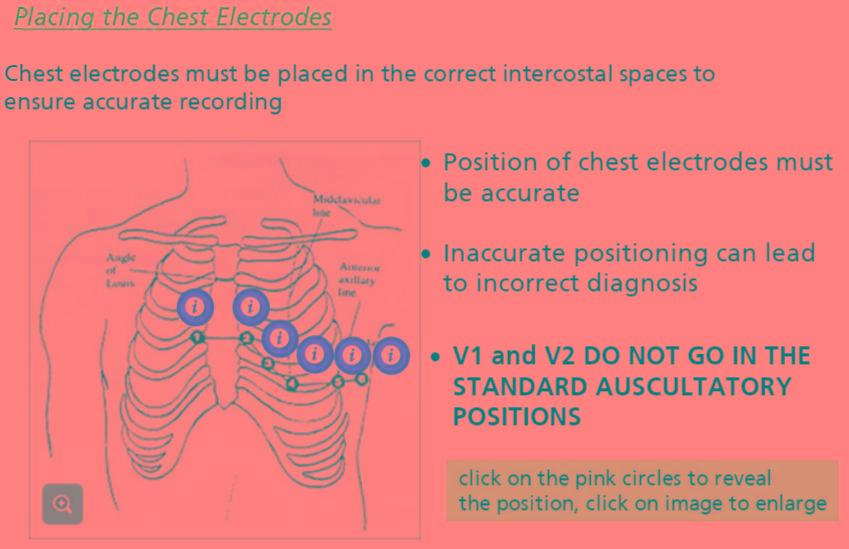 V1 - 4th IC space, right sternal edge V2 - 4th IC space, left sternal edge V3 - between V3 and V4 V4 - 5th IC space, right mid clavicular line (where the apex beat of the heart is normally found) V5 - same level as V4, anterior axillary line V6 - same level as V4&5, mid axillary line