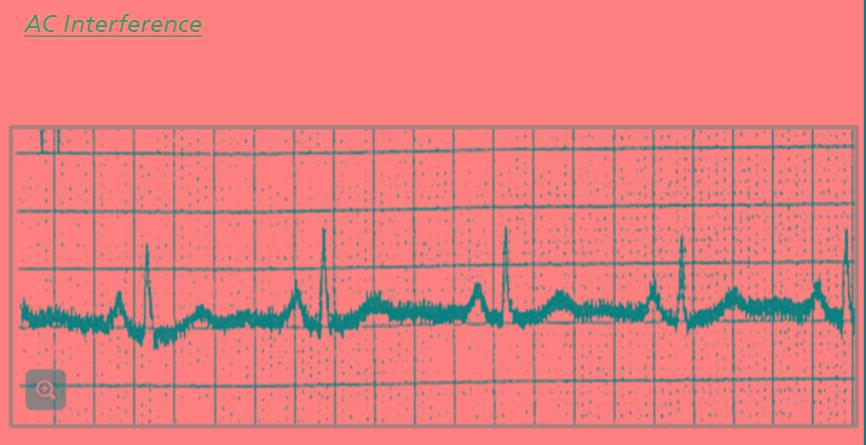 AC interference is displayed as a thick baseline on the ECG waveform - due to electrical interference from other equipment in the room