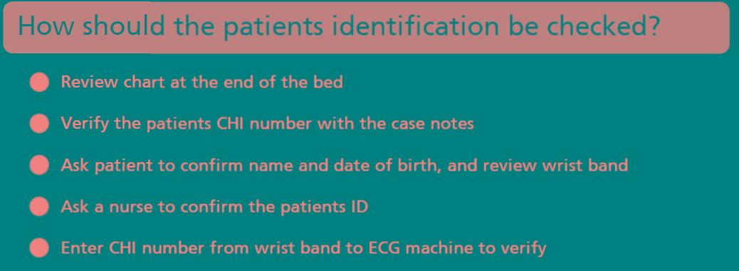 The patients identity should be confirmed by asking the patient to confirm their identity and verifying it against their wristband Their correct patient details should then be entered into the ECG machine