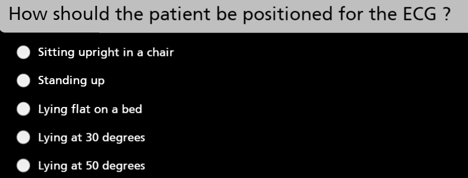 SECTION 1 - HOW TO DO AN ECG What angle should a patient be lying at when performing an ECG? Any pillows?