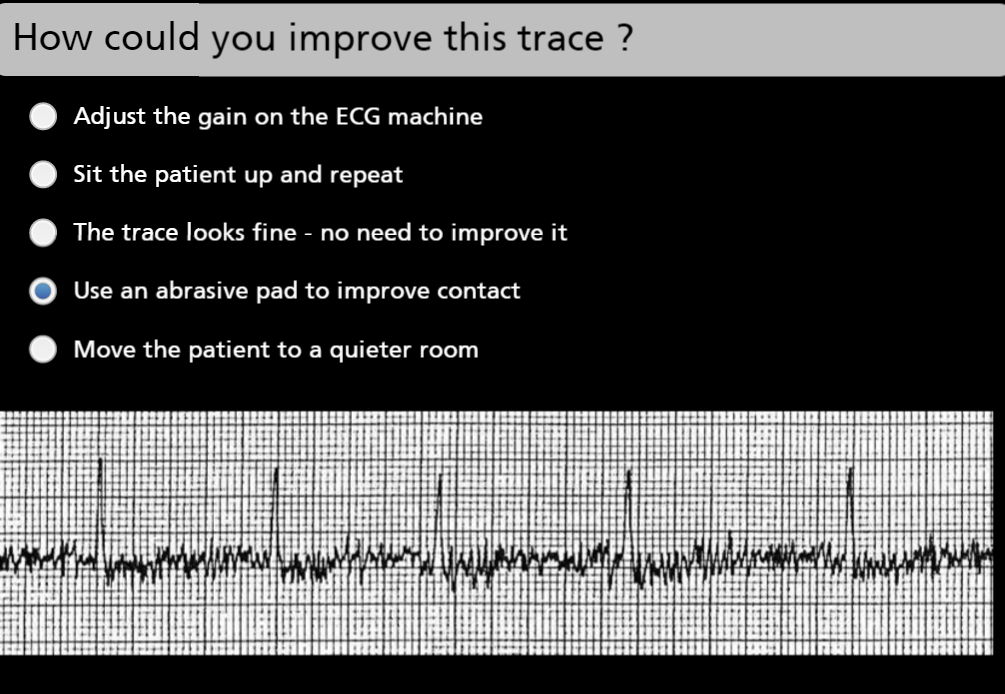 Common tracing problems are due to poor electrode attachment (looks like muscle tremor here) An abrasive pad could be used here to improve contact
