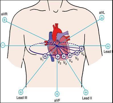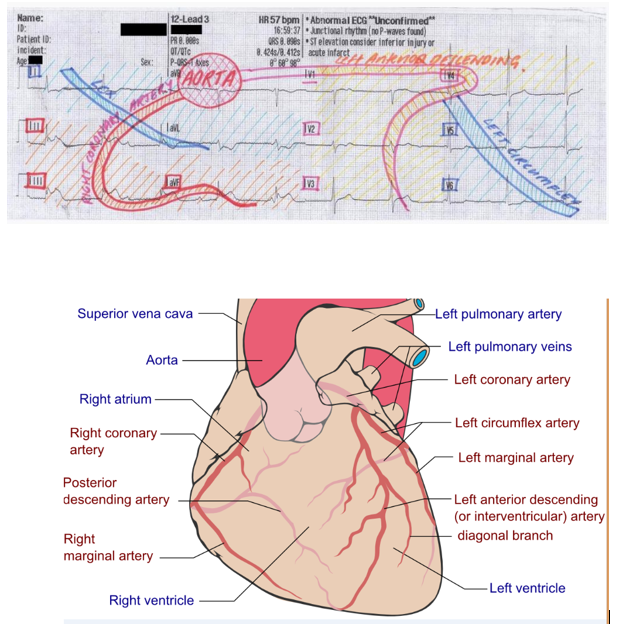 V1-V4 - anterior heart supplied by left anterior descending artery V5,6, I and AVL - lateral heart supplied by left circumflex artery (CAP TEST STATES –> Anterior - V2-V5 Anteroseptal - V1-V3 Anterolateral V4-6, I, aVL) II,II avF - inferior heart supplied by right coronary artery