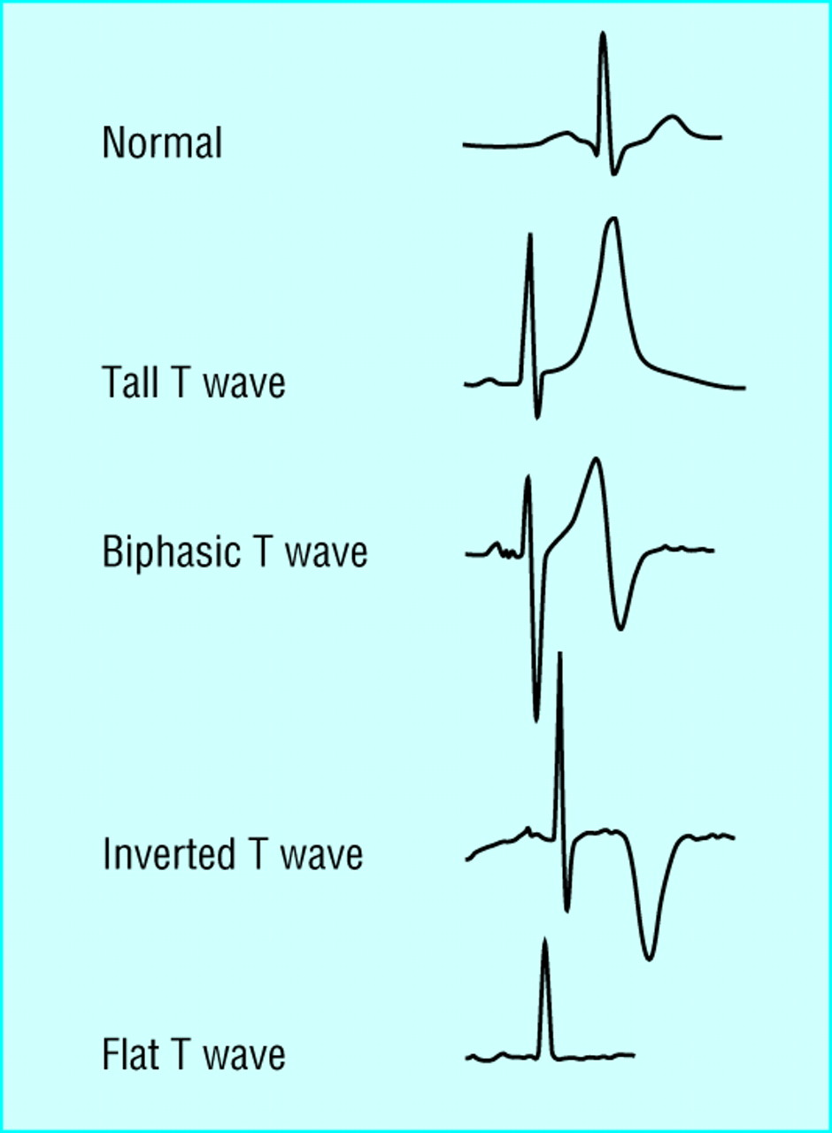 T wave changes Tall T wave acutely Can also be biphasic Can also be inverted Flattened Twaves sometimes after a long period of time after MI