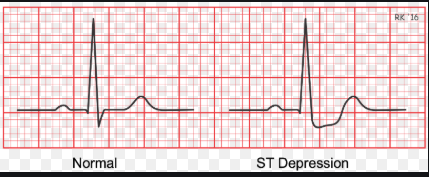 ST segment changes * ST depression can occur (>/= 0.5mm (half a small box) depression in >/=2 contiguous leads) * Widespread and deep depression are generally bad prognostic factors of the ischaemia