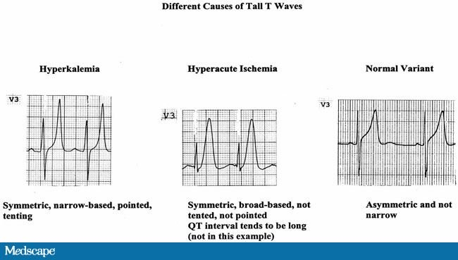 Myocardial ischaemia - the t waves are broad based and not pointed Hyperkaelaemia - tall tented t waves - narrow based and pointed