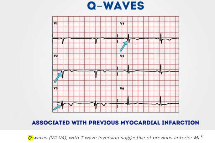 Pathological Q waves must be present in any two contiguous leads, & be >1mm in depth (1 small box) * Any Q waves in leads V1-V3 * Q waves >0.03 (1.5 small boxes) seconds in leads I, II, aVL, aVF or V4, V5 or V6