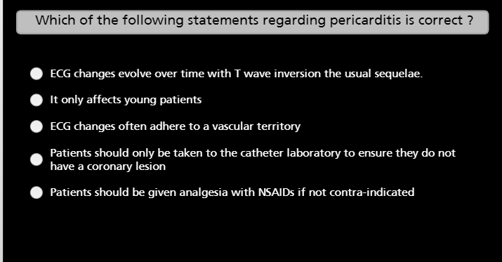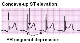 The ECG changes in pericarditis are usually widespread changes involving >1 vascular territory * There is an upward concave ST elevation (saddle shaped ST segment) * PR depressions * ECG changes do not evolve