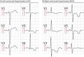 High amplitude QRS complexes suggest ventricular hypertrophy Suspect Left ventricular hypertrophy if dominant S wave in V1 and dominant R wave in V6 Left ventricle already has muscle mass but in hypertrophy , alot more so R waves in V5/6 are large