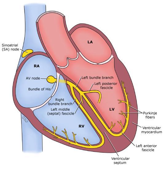 Normally rate is controlled by the SA node - cells with the highest rate of automaticity Electrical activity then flows through the AV node, the bundle of His which separates in left and right bundle blocks before reaching the purkinje fibres at the base of the ventricular myocardium
