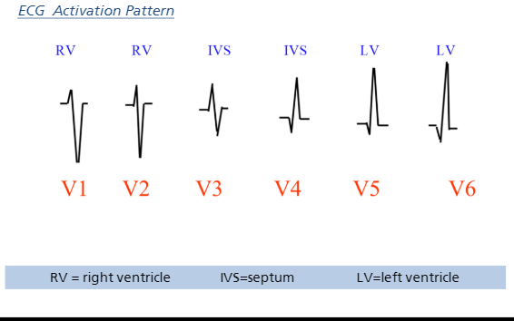 Phase 1 - depolarisation of the septum - causes a small Q wave in leads V4,5,6 as it is away from these electrodes (left to right) Phase 2 - depolarisation of the left &right ventricles - small r wave in V1,2,3 because ventricular mass smaller here r wave progression means R>3 in V4,5,6 as left ventricular mass large