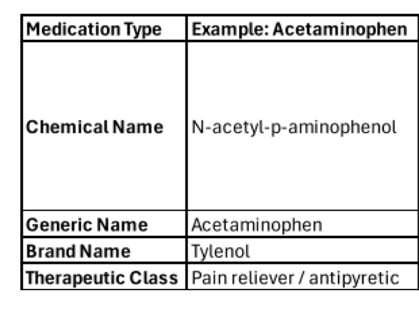 What is the chemical name, generic name, brand name, and therapeutic class of acetaminophen