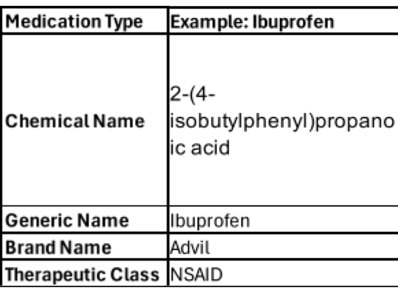 What is the chemical name, generic name, brand name, and therapeutic class of ibuprofen