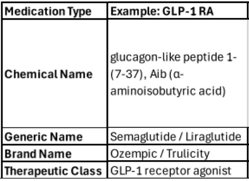 What is the chemical name, generic name, brand name, and therapeutic class of GLP-1 RA