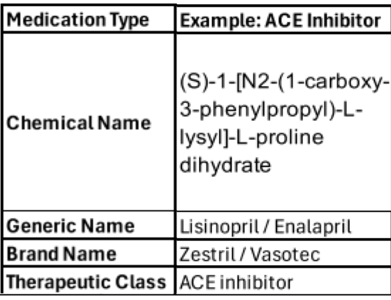 What is the chemical name, generic name, brand name, and therapeutic class of ACE inhibitor