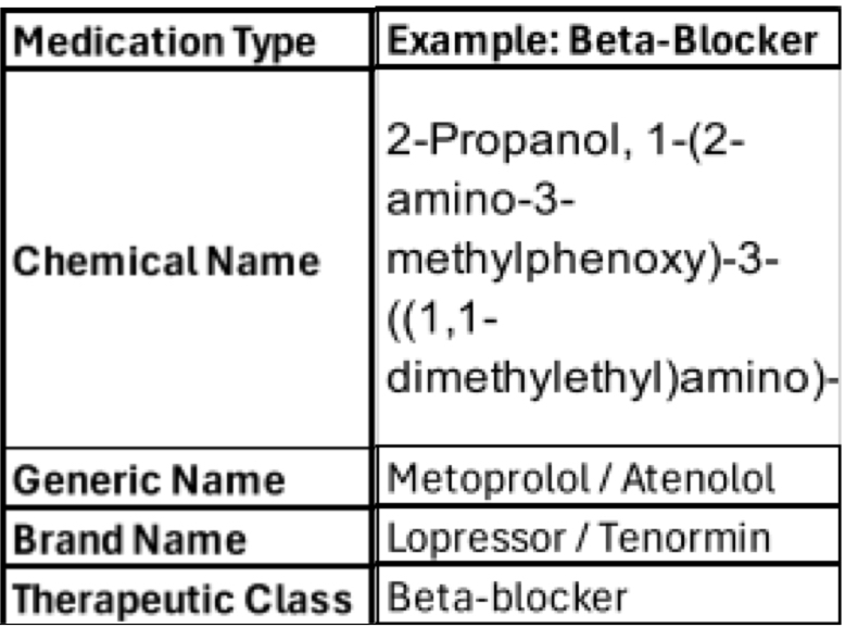 What is the chemical name, generic name, brand name, and therapeutic class of Beta-Blocker