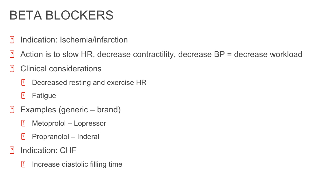 Explain beta blockers (indications, action, clinical considerations, examples)