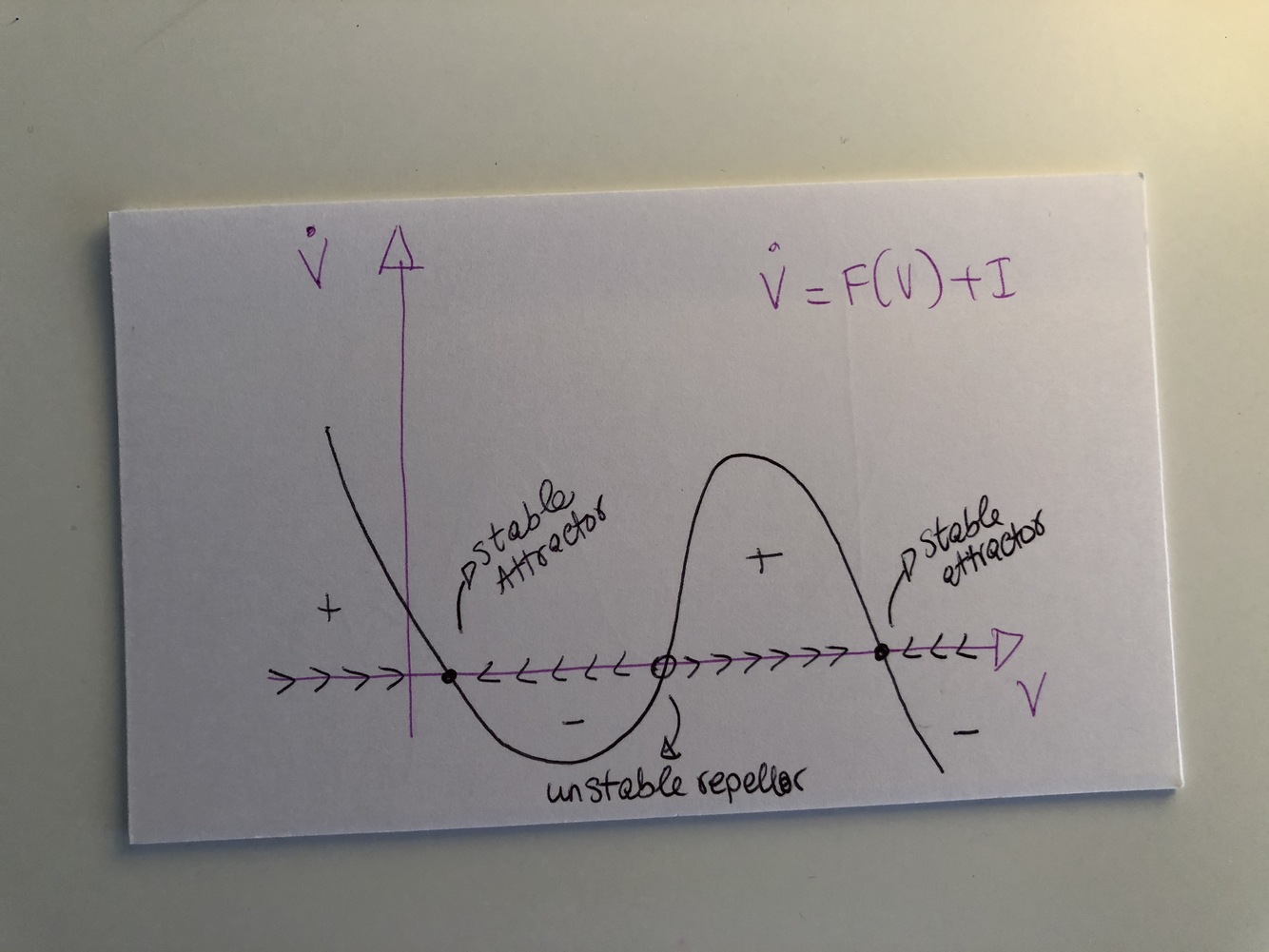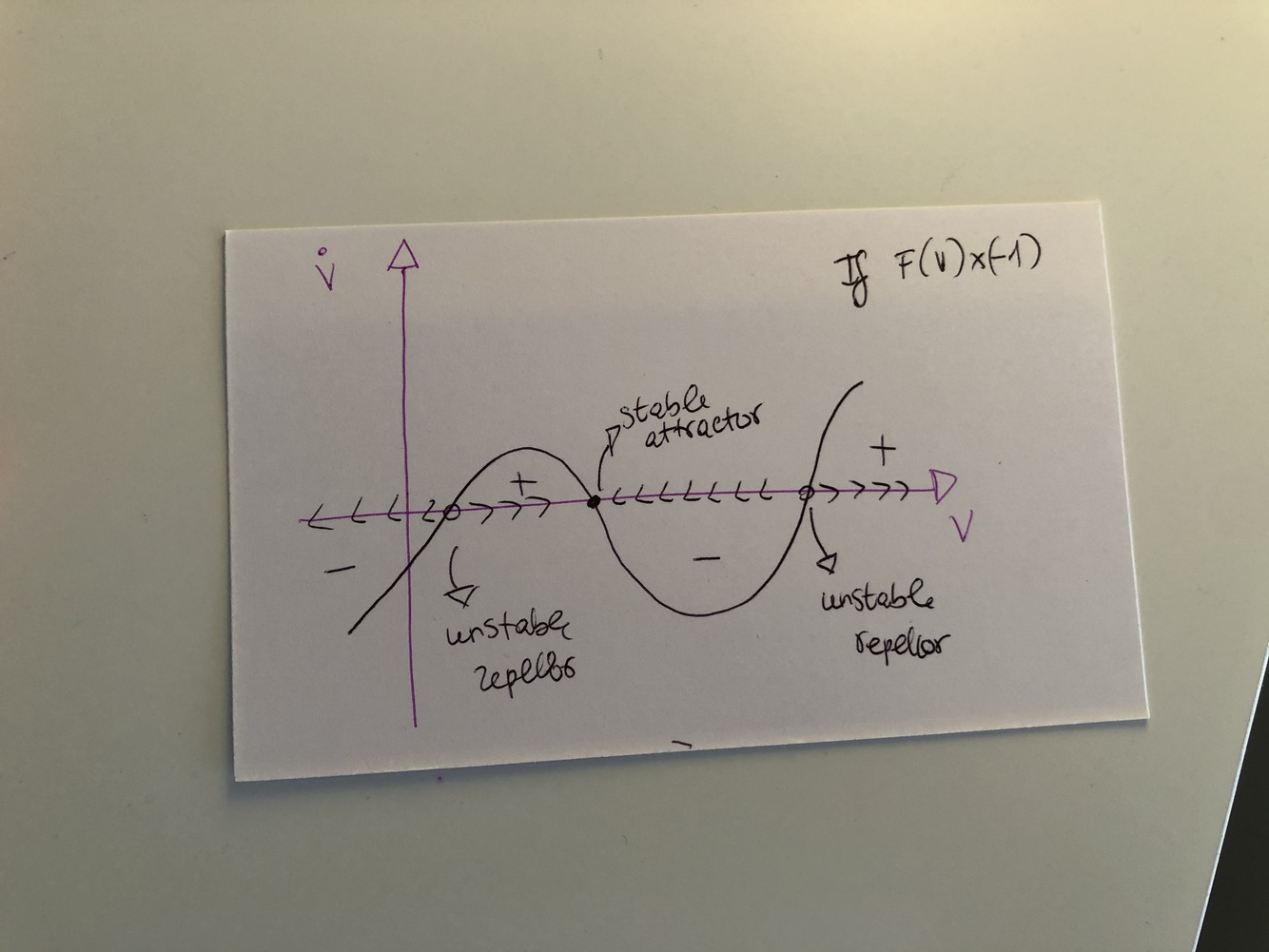 On the other hand, if F(V) is multiplied by -1, the stability of the equilibria will change. We will end up with two repellers and one attractor.