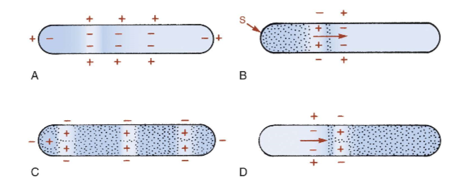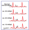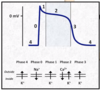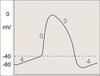 Once this action peaks, K+ is released from the cells driving the cell back to its resting state (-90 mV cardiac myocytes, -60 mV nodal cells)