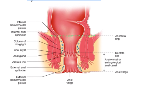 The dentate line is situated 2 cm from the anal verge and marks the transition between the upper and lower anal canal.