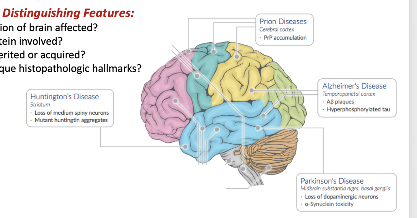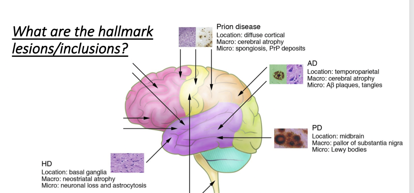 differentiate between the halmark lesions in alzhemiers, huntington, parkinson and prion disease
