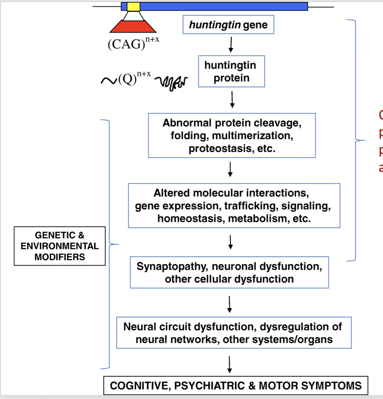 Autosomal dominant inheritance of expanded trinucleotide repeats (CAG) in huntingtin gene àpolyglutamine tracts in huntingtin protein