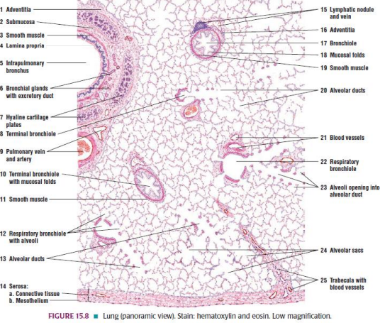Epithelium goes from pseudostratified columnar ciliated in the larynx and trachea to a simple cuboidal non-ciliated form in the alveoli