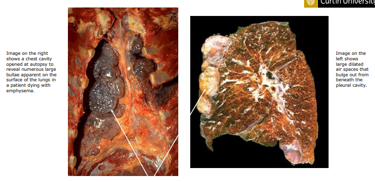 - severe destruction of small airways lead to the formation of large air pockets referred to as bullae that replace lung tissue - called bullous emphysema